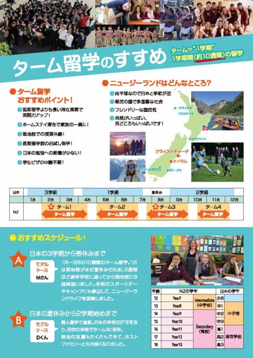 という方に最適になのが、中学・高校のターム留学(1学期間の留学)です。ニュージランドの中学/高校は4学期制(4ターム制)です。1学期間(約10〜11週間)の中学・高校への留学+ホームステイで、学生ビザを取得せずに留学ができます。当社ではターム留学の方向けにお得なパックをご用意! 中学・高校入学前に短期語学学校通学も可能です。